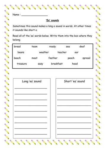2 words that spell short e with ea 3 words that spell long e with ea when teaching word study its important to give your child plenty of practice sorting the words. Thats why it is first its the more usual sound of the ea phonogram. Rwi set 3 worksheets interactive activities and other resources to help children learn to read and spell words containing the ea long vowel phoneme.