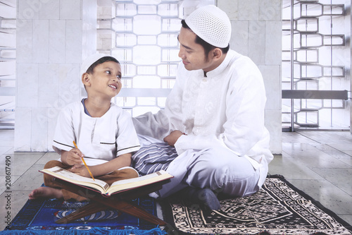 Child And Father Reading The Quran In Mosque Stock Image Image Of