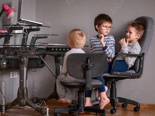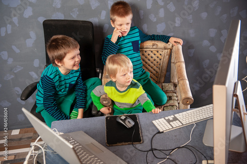 Funny Kids Watch Educational Program On Computer And Learn To Read