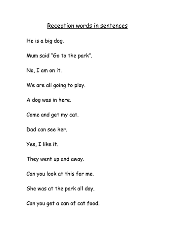 Reading Reception Level Words In Sentences By Bgreen73 Teaching