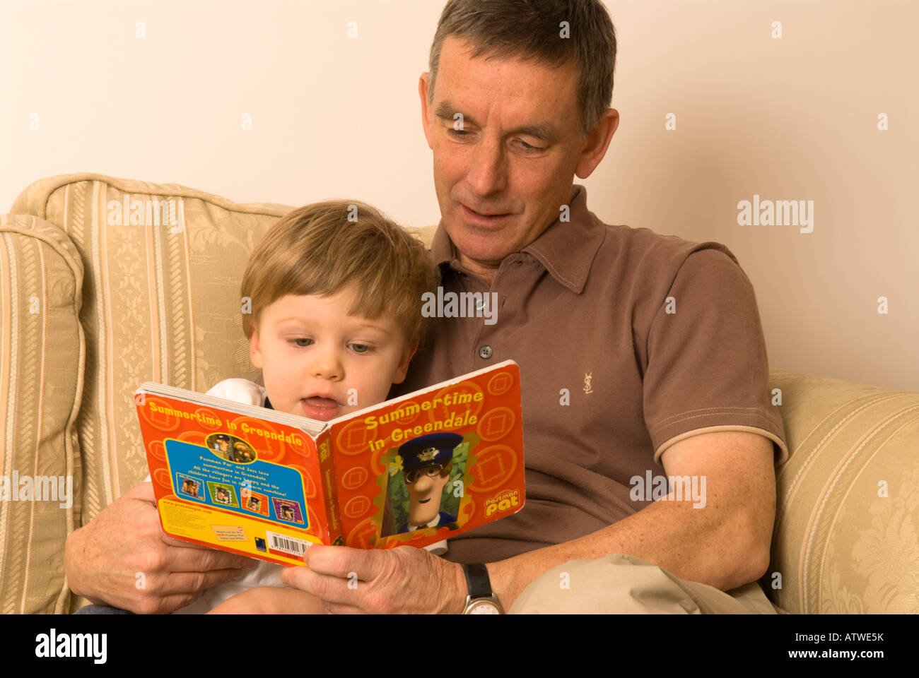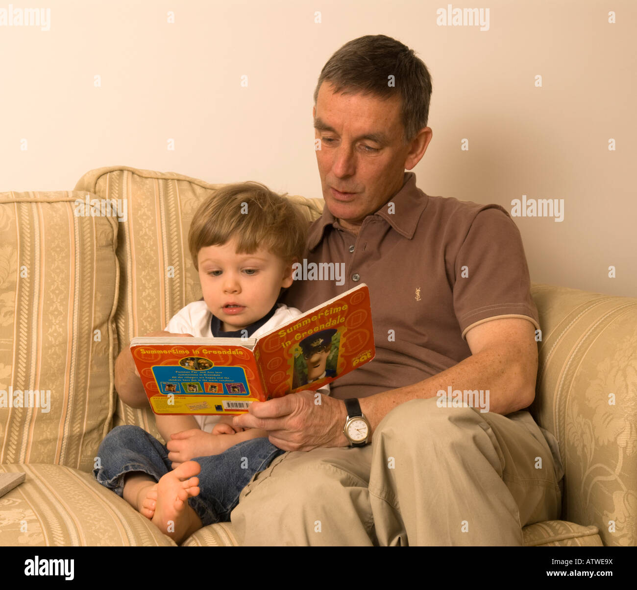 Grandfather Father Reading Book To Two Year Old Grandson Son Stock
