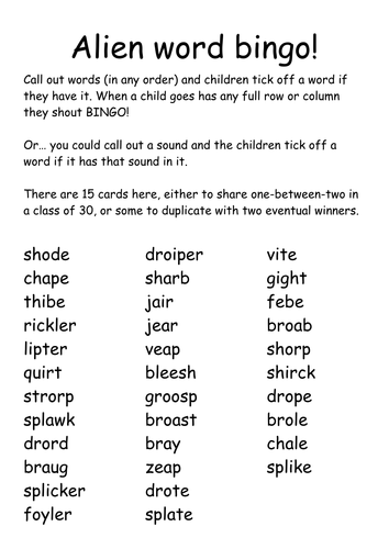 Alien Bingo Practice For Y1 Phonics Screening By Lukeliamlion