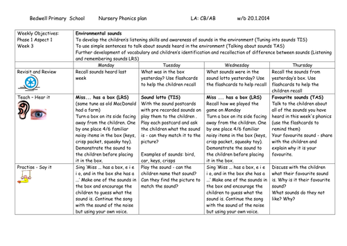 Weekly Phase 1 Aspect 1 Phonics Plans By Bdavis7 Teaching Resources