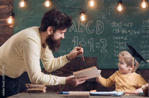 Teacher Concept Teacher Read Book To Little School Boy Teacher Man